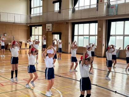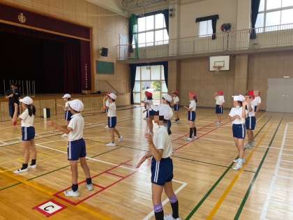 授業の前半は、音楽のリズムに合わせて、両足ジャンプ、片足ジャンプなど、それに手の動きもつけた運動をしました。