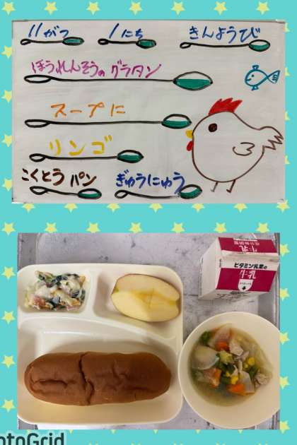 金曜日は、パン献立にとても良く合う『ほうれんそうのグラタン』が登場しました。クリームを使用することでコクをだしています。