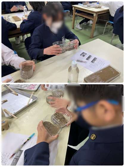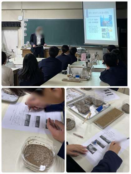 今日は理科特別授業ということで講師先生に来ていただき、「地震による地盤の液状化とその影響を考える」というタイトルでお話をしていただきました。