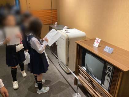 学校でお弁当を食べてから、地下鉄に乗って今昔館へ。まず、大きなホールで体験学習をしました。ローラー洗濯機やダイヤル式の電話など、実際に触ることができました。