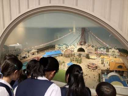 その後、館内の見学へ。江戸時代の町屋通りでは、薬屋・本屋・建具屋などを見学し、展示階では、社会で学習している昔の梅田駅の様子や大大阪(だいおおさか)についての展示を見ました。じっくり学ぶ三年生の姿が見られました。