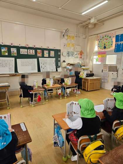今日は、靭幼稚園の子どもたちと、1年生の子どもたちで交流しました。4月から1年生になる靭幼稚園の子どもたちに、1年生が発表しながら、教えることができました。