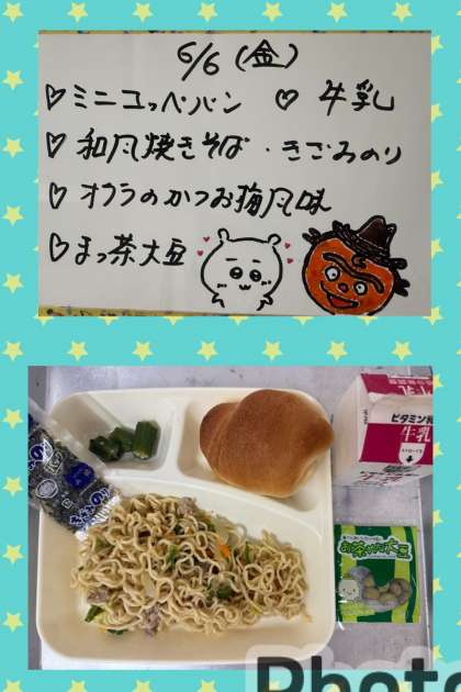 金曜日の『和風焼きそば』は、豚肉を主材にした、しょうゆ味の焼きそばです。食べる時にきざみのりをかけて食べます。