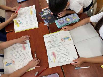 国語科の学習では「名前を見てちょうだい」という物語をしています。赤い帽子をもらった主人公のえっちゃんの身に不思議な出来事が起こります。場面ごとに出てくる「名前をみてちょうだい」というフレーズが印象的な物語です。「新たな登場人物がここで出てきた。」「帽子が別の場所に飛んで行った!」と物語をしっかり読み込み、場面ごとに分けました。学習の最後には、自分のお気に入りの場面を見つけていきます。