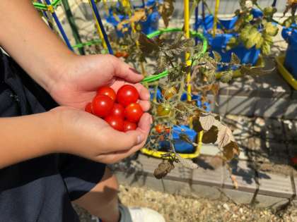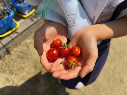 苗のことからせっせとお世話をしてきたトマトが赤く実ってきました。大きく成長したトマトをうれしそうに収穫する子どもたちの姿が見られます。自分で育てたトマトのお味はいかがでしょう〜?? お家の人と食べてみてね。