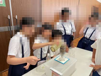 施設の見学が終わり、次は水が綺麗になる仕組みに関する実験を行いました。最初は濁っていた水を自分たちでろ過装置を使って綺麗にしていきます。綺麗な水ができると、子どもたちは、「すごい!とても綺麗になった!」と驚きの声をあげていました。