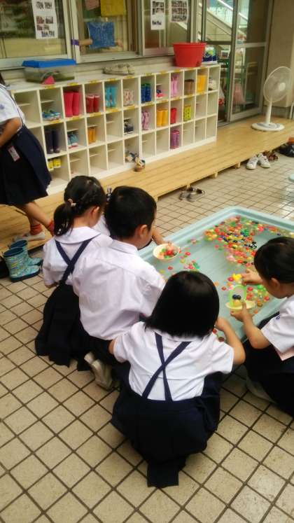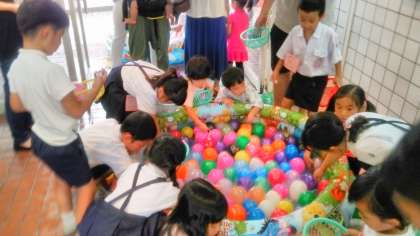 西船場幼稚園でふれあいなつまつりが行われました。おまつりに招待された1年生は、ヨーヨー釣りやボール投げ、魚釣りゲームなど楽しい遊びにいっぱい参加させてもらいました。