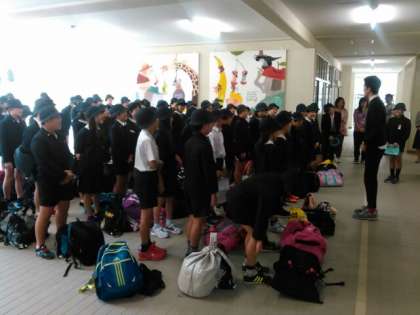 みんな普段よりは早い集合時間にも関わらず、遅れることなく登校できました。楽しみにしていた修学旅行に元気に出発しました。