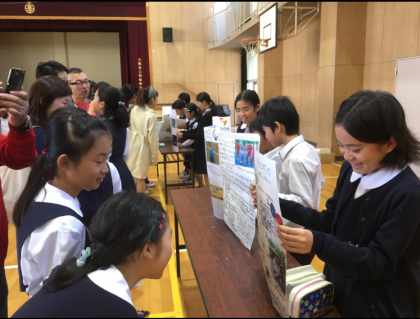 お客さんとなった保護者や友だちを相手に、自分で作ったポスターを見せながら上手に発表を行うことができていました。