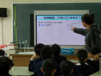 3年生では、気象庁の人が作ったスライドを見ながら、地震や防災についてクイズを通して、学習しました。