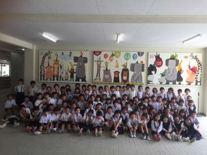 作家の武内祐人さんが、「みんなが笑顔になるように!」と絵を描いてくださいました。2年生の国語科の教科書の表紙も武内さんの作品だと知り、子どもたちはより親近感を持ったようすでした。