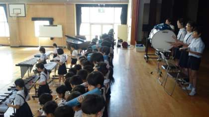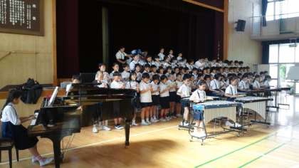 呼びかけに始まり、二部合唱や、リコーダーなどの合奏をします。音楽の授業だけでなく、朝学習の時間や、休み時間に自主的な練習をする姿も見られました。