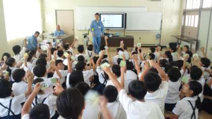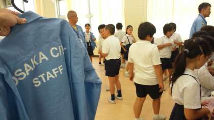プロジェクターを使って、ごみに関する話やクイズ、地球温暖化・温室効果ガスなどの話をされました。大阪市のマークが記されている青色の作業着が、普段ごみに出しているペットボトルからできていることを知って、子どもたちは「えーっ!」という声を上げていました。