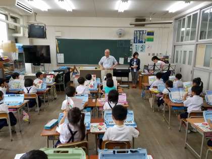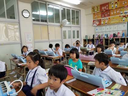 6月28日(水)、YAMAHAから講師の方に来て頂きました。1〜4時間目で1組から4組までの各クラスを教えて頂きました。学校での初めてのけんばんハーモニカの授業で、子どもたちは活発に授業に取り組んでいました。