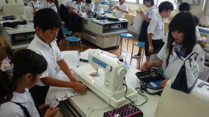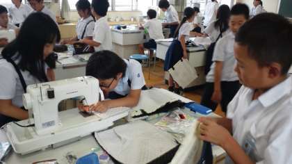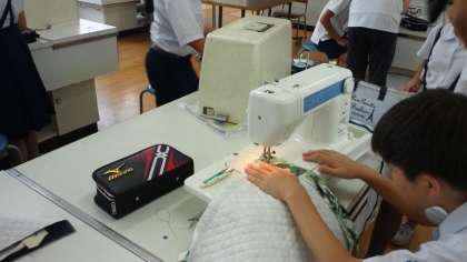 家庭科では、ミシンを使ってナップサックを作製しています。なかなかうまく進まず、とても難しいようです。