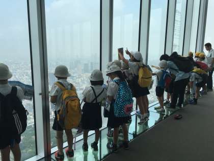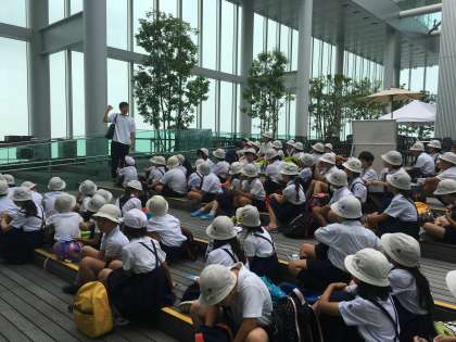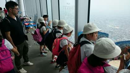 7月6日(木)、社会科の学習で「あべのハルカス」に社会見学に行きました。みんな高いところに大興奮で、『高いと、すごく遠くまで見えるね!』『西の方にはUSJが見えるよ!』など、各方位で見えるものをしっかりと観察し、大阪市の様子を学習することができました。