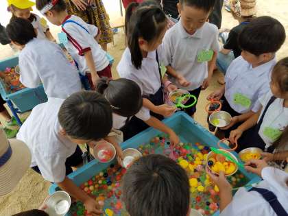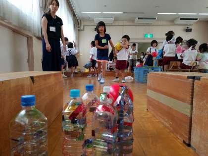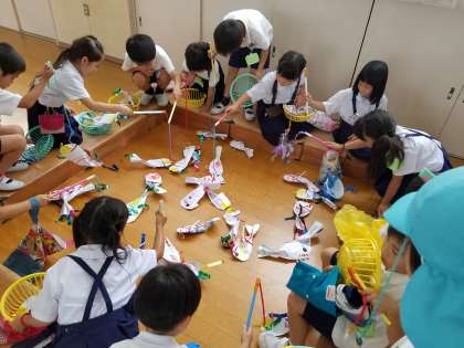 7月12日(水)、1時間目〜2時間目に幼稚園での夏祭りに参加させていただきました。スーパーボールすくいや魚釣り、ボーリングなど、楽しいお店がたくさんあって、子どもたちはとても楽しんでいました。お土産としてヨーヨーとスーパーボールをいただきました。