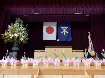 入学式を始めるにあたり、まず新6年生があいさつをしました。また、新2年生は「おむかえのことば」で学校の様子を紹介しました。