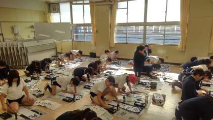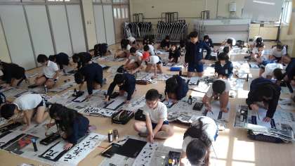 教室とは違って椅子に座らず、床に膝をついて行いました。また、普段よりも長い半紙を使ったこともあり、子どもたちは緊張した面持ちで一字一字、心を込めて力強く書き上げました。