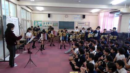 リコーダーや鍵盤ハーモニカに加え、小太鼓やタンバリンなどの打楽器、アコーディオン、鉄琴や木琴など、さまざまな楽器でハーモニーを奏でています。