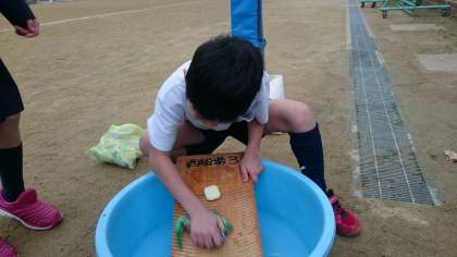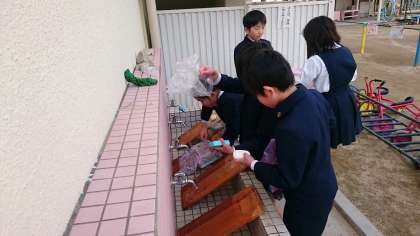1月26日(金)、社会科の学習で「昔の道具体験」を行いました。まず、せんたく板を使って、ナフキンの洗濯を行いました。雪が舞う屋外、冷たい水で洗濯をしていると、「水が冷たいから、手が思うように動かない…」や「昔の人は、こんな辛い思いをしながら洗濯していたの!?」、「今は洗濯機があって便利だね」など、昔の生活の大変さを実感し、今の生活との違いを見つけることができました。