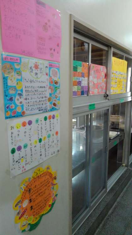 感謝の気持ちを込めたポスターを手渡しし、給食室に飾っています。カルタのように一人ずつ書いたり、野菜やキャラクターを描いたりと、それぞれのクラスの趣向が凝らされています。