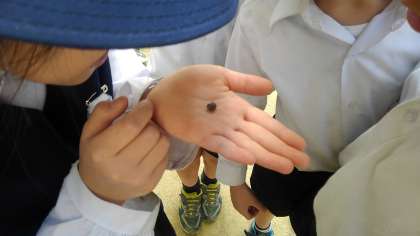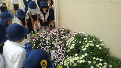 学習園に植えている黄色いアブラナやマリーゴールド、また地面を散歩しているダンゴムシなどの小さな昆虫をじっくりと観察しました。