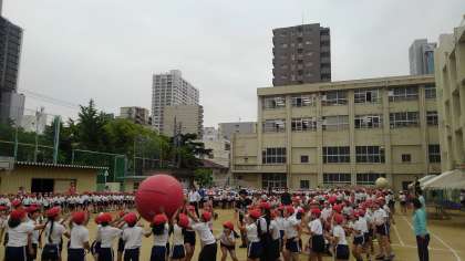 その中で、大玉送りの練習をしました。小学生だけでなく、西船場幼稚園の子たちとも一緒に力を合わせました。