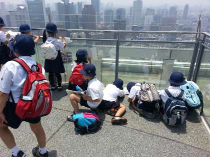 5月30日(金)3年生は社会見学で、大阪環状線一周と梅田スカイビルへ行きました。「環状線や梅田スカイビルから、大阪市の様子を調べよう。」をねらいに、児童たちは、興味津々に電車の窓から見える風景を眺めてメモしていました。電車内では、内側・外側に分かれて見学し、お互いに見えた物の情報交換をしていました。梅田スカイビルの空中庭園では、360度の視界と風を感じながら大阪市の街並みを見渡しました。