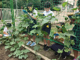恵みの雨によって、毎日すくすく成長している「ひょうたんくん」と「へちまちゃん」です。ヘチマの花が咲きました。子どもたちは、
