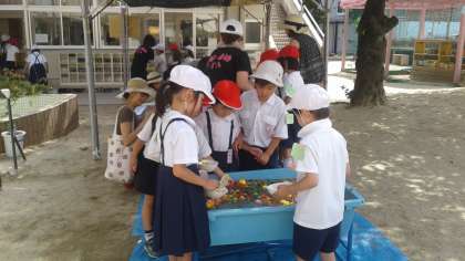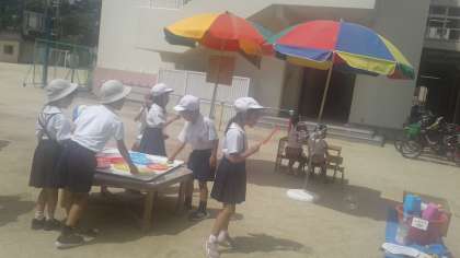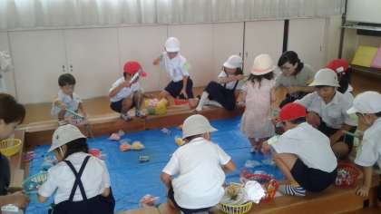 先週の7月11日(水)、1年生は西船場幼稚園の子ども祭りに参加させていただきました。