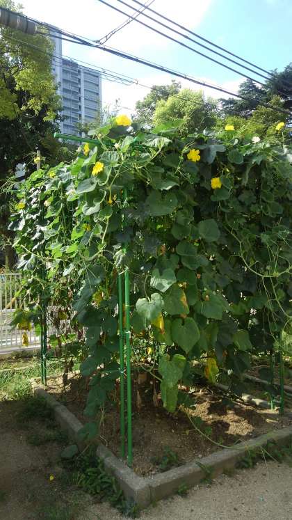 校庭のヘチマも大きく青々と育っています。黄色い花も可愛らしく咲いていますが、どこかお水を欲しがっているようにも見えます‥‥。