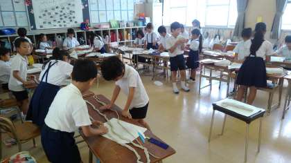 体重を乗せて平べったくしたり、へびのように細長くしたり、指でつまんで模様にしたりして、ねん土とふれあいました。