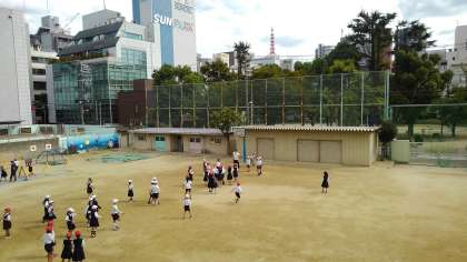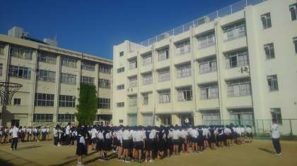 雲一つない澄み渡った空の下で、週はじめの月曜日に全校朝会を行いました。