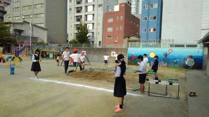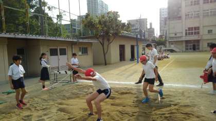 5年生の体育では、走り幅跳びに取り組んでいます。少しでも距離を伸ばそうと、ジャンプする直前や跳んでいるときの姿勢に気をつけています。