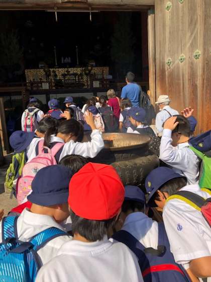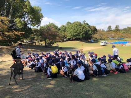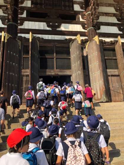 10月18日(木)奈良公園に秋の遠足へ行きました。雨のため延期になっていたので、子どもたちはより楽しみをふくらませていました。奈良公園ではグループごとのフィールドワークを行い、世界遺産をめぐりました。道を間違えることもありましたが、みんな無事にゴールの東大寺にたどり着きました。