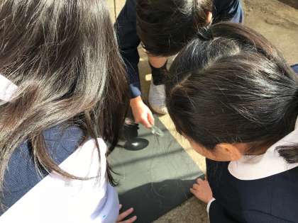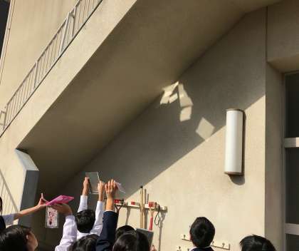 一つ目は、「日光を鏡で反射させた光を集めるとどうなるのか?」です。光を集めると重なったところがより明るくなりました。みんな一生懸命ひとつの場所に光を集めようとするのですが、ぶれてしまって難しかったようです。