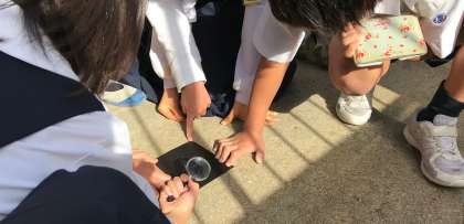 二つ目は、「日光をルーペを通して光を集中させるとどうなるのか?」です。ルーペを通した光をできるだけ明るくそして小さくしていくと、黒い折り紙から煙が出てきました。その瞬間「おー!」っと歓声が上がりました。そして、焦げたにおいが「焼き芋みたい!」と言っていました。
