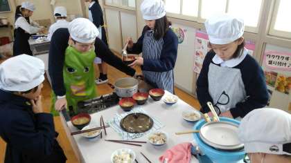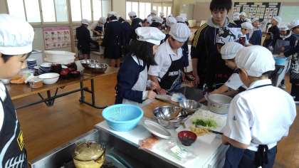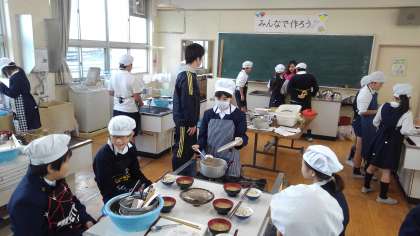 今日で2学期の授業も最後となり、1組も2組も、自分で縫ったエプロンを身にまとって調理実習をしました。