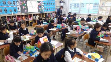 車輪をひとたび手にすると、声を上げて喜び、コロコロと転がしたくなる2年生。今回は、思い思いの夢の詰まった「ドリームカー」を作りました。