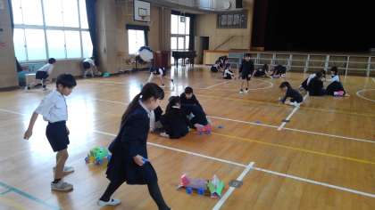 試作段階のうちから、作っては走らせ、作っては走らせるのを繰り返し、想像が膨らんでいっている様子でした。なかには、教室にある机の脚や壁にぶつかってしまい、少し壊れてしまうこともありました。しかし、難しいことや失敗したことを乗り越えようと、必死に作っていました。