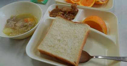 本日の献立は、主食の食パンとりんごジャム、スープ煮と鶏肉のみそバターソースでした。デザートには、デコポンも付いてきました。