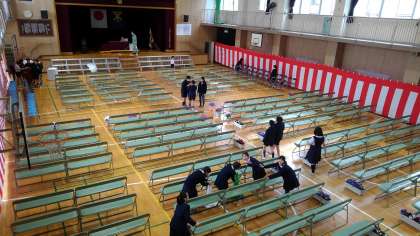 各担当場所に分かれて、ピロティや玄関先、廊下などをホウキ・モップをしたり、講堂の椅子を非常にたくさん並べたりしました。