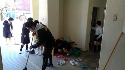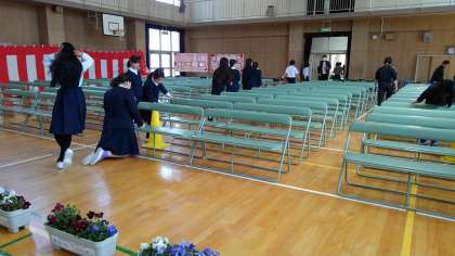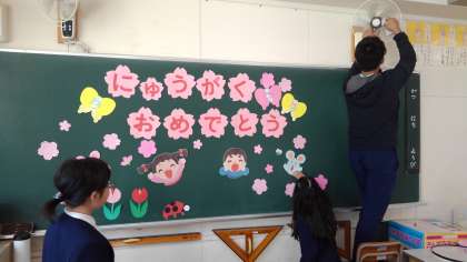 ピロティやトイレを綺麗に掃除をし、講堂にいすをたくさん並べ、そして新しい1年生の教室に飾り付けをしました。