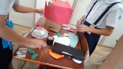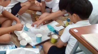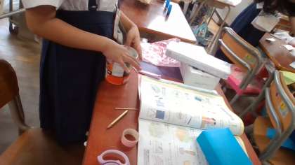 家からもって来たもので、自分たちで考えたおもちゃを制作中です。