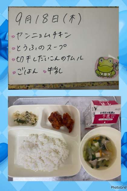 木曜日の『ヤンニョムチキン』は、韓国・朝鮮の料理です。鶏肉にしょうが汁、にんにく、料理酒で下味をつけ、でんぷんをまぶして揚げ、みりん、こい口しょうゆ、ケチャップ、コチジャンで作ったタレをからめています。
