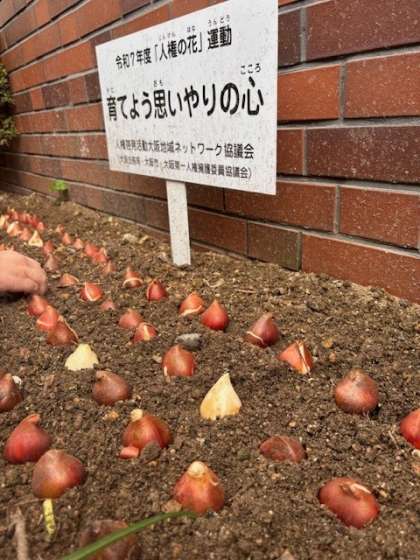西区「人権の花運動」の活動として、正門前にチューリップ100個を環境委員会で植えました。