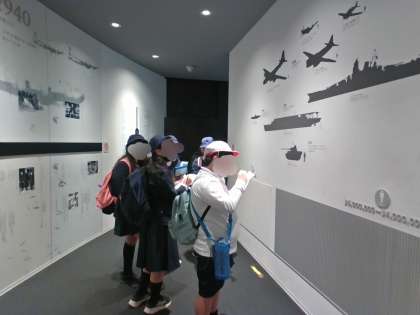 ピースおおさかでは、戦時中の小学生の生活や社会の様子、大阪大空襲についての展示等を、熱心にメモをとりながら見学しました。「戦争は兵隊だけでなく、国民も苦しい生活をしなければならなかったことがわかった」「国が事実を教えてくれないことがあったなんて、知らなかった」など、様々な感想を話し合い、戦争の恐ろしさや平和の尊さを学びました。