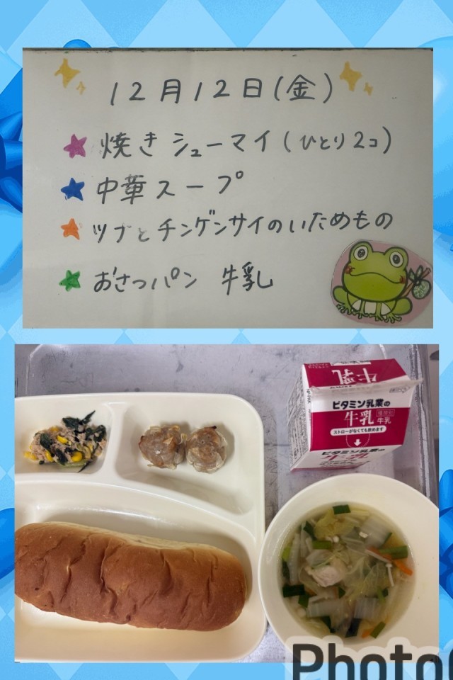 金曜日の『中華スープ』は、鶏肉、はくさい、たまねぎ、にんじん、えのきたけ、青みににらを使用したスープです。