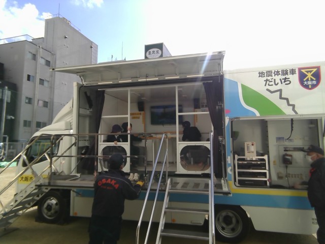 全体での避難訓練の後、5年生は地震や津波についてのお話を聞いたり、起震車に乗って震度7の揺れを体験したりしました。